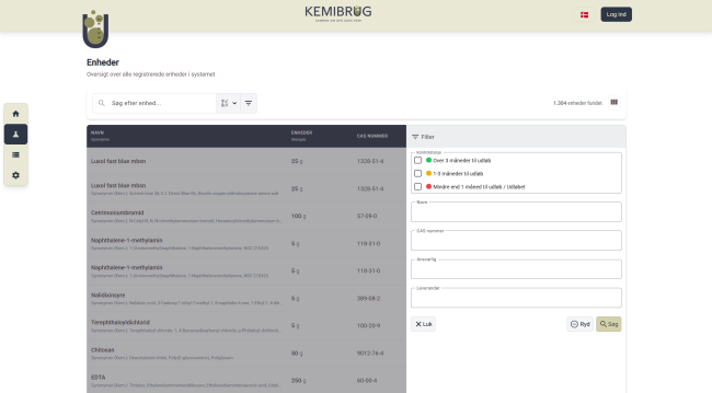 Mulighed for at filtrere listen på flere specifikke felter samtidigt: Kemikalienavn, CAS-nummer, ansvarlig og leverandør. Også mulighed for at filtrere efter tid til kontrol/-udløbsdato (der vil også være mulighed for notifikationer, når en kemikalieenhed er ved at udløbe).